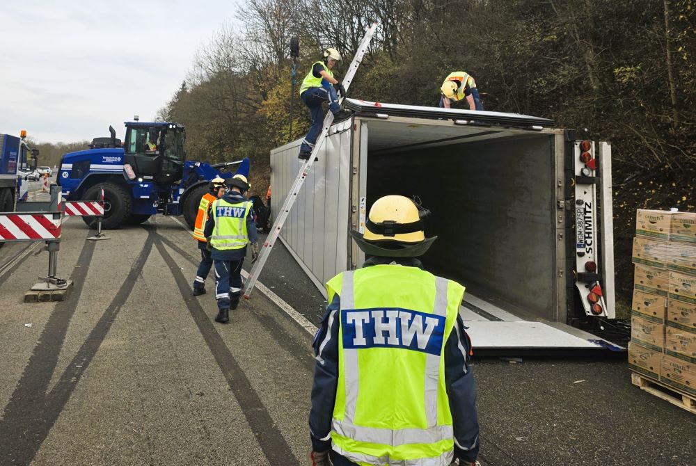 Dillenburg. Ein Sattelzug, beladen mit 20 Tonnen Bananen, ist am Donnerstagmorgen (13. November) auf der Autobahn bei Dillenburg umgekippt. Mit 26 Einsatzkräften haben wir die Fracht umgeladen und abtransportiert.