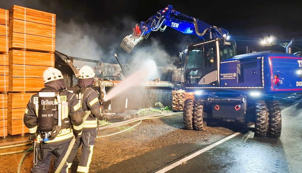 Merenberg (Landkreis Limburg-Weilburg). Die gleiche Gegend (Landkreis Limburg-Weilburg), die gleiche Schadenslage (Großbrand), die gleiche Anforderung (Unterstützung Feuerwehr mit Bagger). Nur 12 Stunden nach dem Einsatz auf einem Pferdehof in Löhnberg mussten unsere Helfer ins benachbarte Merenberg fahren, wo ein Sägewerk in Flammen stand.