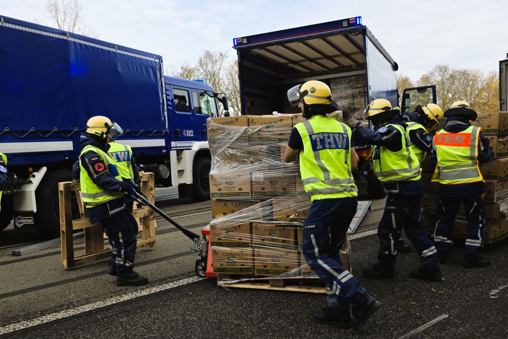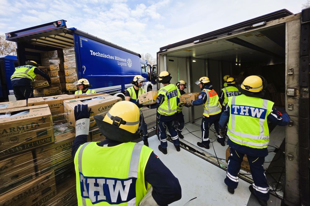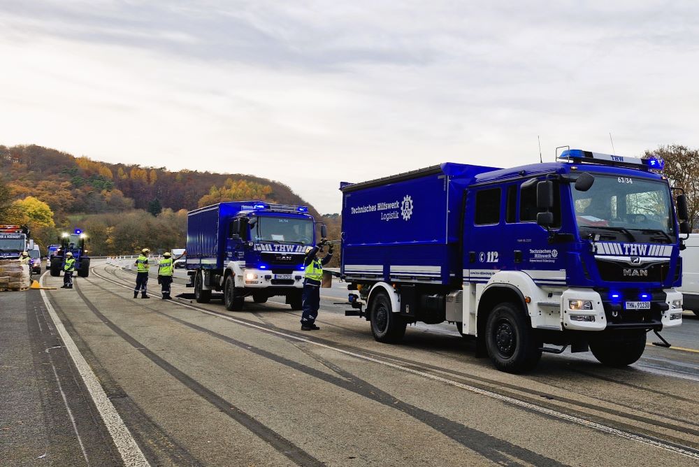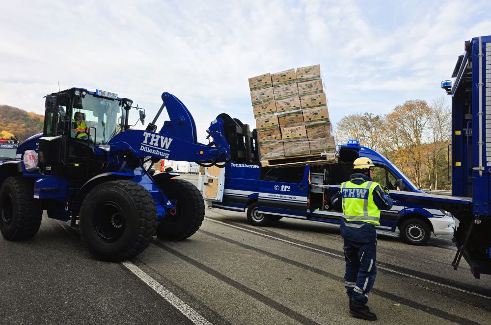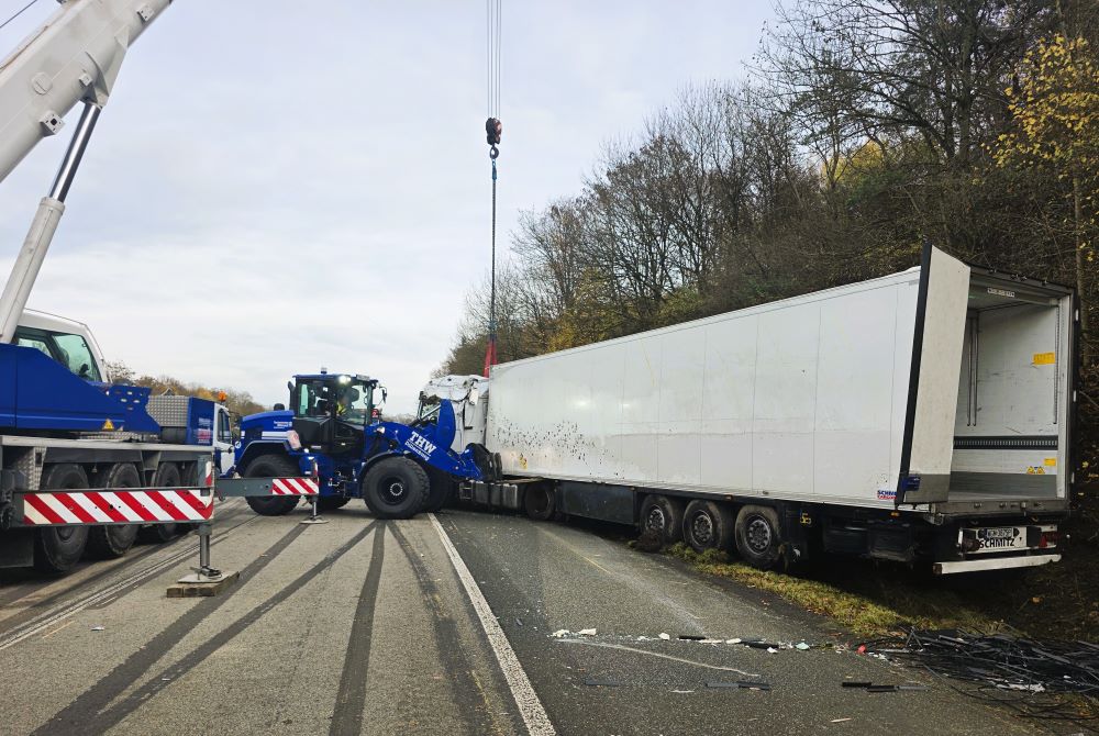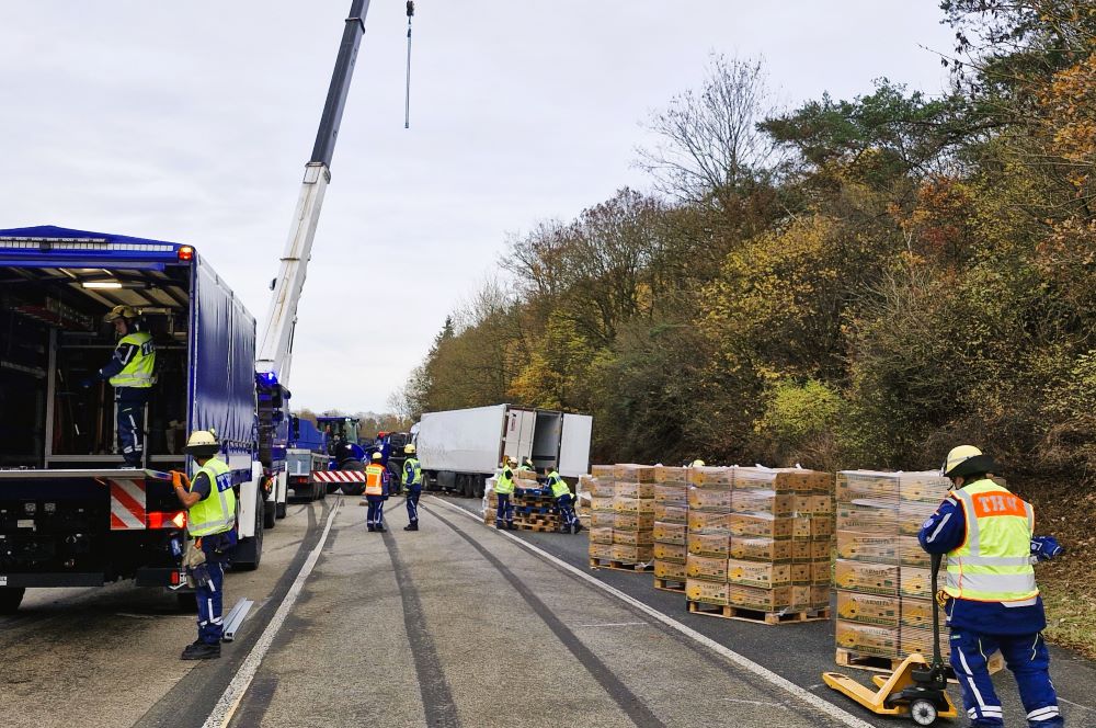 Das angeforderte Bergungsunternehmen konnte den Aufwand, alle 1000 Bananenkartons per Hand aus dem Sattelauflieger zu holen, personell nicht stemmen, sodass mittags das THW hinzugerufen wurde. Die Einsatzkräfte holten die 20 kg schweren Kartons einzeln nach dem Prinzip Sandsackkette aus dem Unfallfahrzeug und stapelten sie auf Paletten. Der Radlader hievte diese dann auf unsere LKW, denn das THW war neben der Bergung auch mit dem Abtransport beauftragt worden. Mit sechs Transportfahrten gelangten die 20 Tonnen Bananen nach Siegen in eine Lagerhalle. Mit dem Radlader unterstützen wir schließlich noch das Aufrichten des Sattelzugs. Kurz vor Einbruch der Dunkelheit war der Einsatz beendet.
