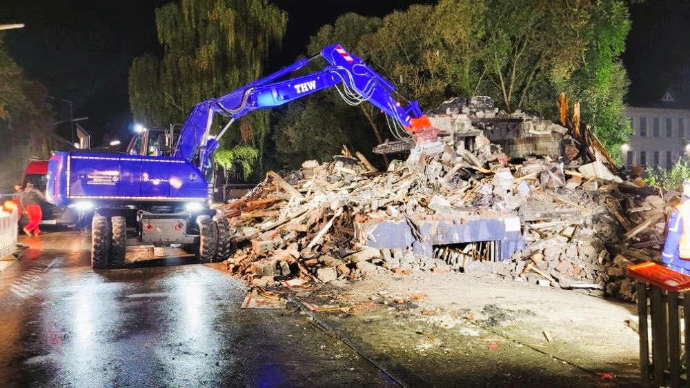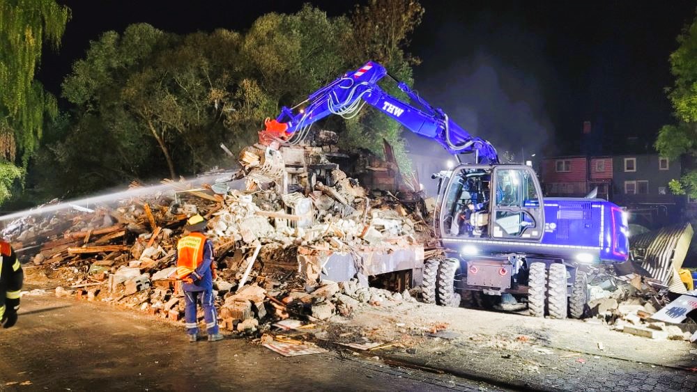 Daaden (Landkreis Altenkirchen). Am Donnerstagnachmittag (25. September) erschütterte eine Explosion den Ortskern von Daaden und zerstörte ein Wohn- und Geschäftshaus. Es gab acht Verletzte, unter den Trümmern aber keine vermissten Personen. Für die Aufräumarbeiten forderte die Einsatzleitung unseren Bagger an. Die Unterstützung der Feuerwehr dauerte bis ca.4 Uhr Freitagnacht.